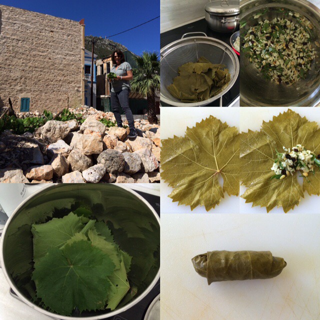Select young, large leaves. Cut stems level with leaves. Blanche by pouring over boiling water and set aside to cool while making stuffing. This makes the leaves supple to roll. Gently fry one large finely chopped onion in a little olive oil. When slightly browned add to parboiled rice. Add a handful of currants and another of pinenuts. Finely chop parsley, mint and dill and add to mixture. Season well with freshly ground pepper and salt to taste. Take a leaf and place it face down on a board. Place a large teaspoon of mixture on the middle of the leaf and fold in the sides. Roll up into a neat parcel. Squeeze firmly. Place side by side into a small heavy bottomed casserole lined with leaves until all mixture is used up. Just cover rolls with water and put on to simmer very gently for 45 minutes. Turn off and leave to cool in pot. The rolls will continue to absorb moisture. Serve with plain Greek yoghurt.