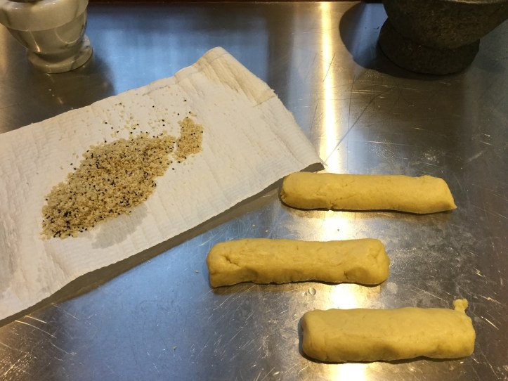 Meanwhile put sesame seeds and nigella seeds into a strainer and wet. Put on a tea towel or paper towel.